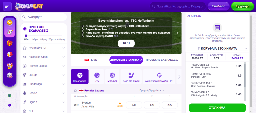 Το RoboCat Casino προσφέρει μια ολοκληρωμένη εμπειρία αθλητικού στοιχήματος, καλύπτοντας πλήθος αθλημάτων και διοργανώσεων. Οι παίκτες έχουν τη δυνατότητα να στοιχηματίσουν σε δημοφιλή αθλήματα όπως ποδόσφαιρο, μπάσκετ, τένις και χόκεϊ επί πάγου, αλλά και σε διαδικτυακά παιχνίδια FPS και eSports. Η πλατφόρμα επιτρέπει ζωντανό στοίχημα, παρέχοντας τη δυνατότητα τοποθέτησης στοιχημάτων σε πραγματικό χρόνο με συνεχείς ανανεώσεις στις αποδόσεις. Οι δημοφιλείς επιλογές στοιχημάτων προσφέρουν εύκολη πρόσβαση σε αγορές με υψηλές αποδόσεις, καλύπτοντας σημαντικά αθλητικά γεγονότα και πρωταθλήματα όπως η Premier League, η La Liga και η Bundesliga. Η διεπαφή της πλατφόρμας είναι φιλική προς τον χρήστη, επιτρέποντας γρήγορη πλοήγηση και άμεση τοποθέτηση στοιχημάτων. Το RoboCat Casino συνδυάζει ποικιλία επιλογών στοιχήματος με υψηλή αξιοπιστία, δημιουργώντας ένα ανταγωνιστικό περιβάλλον για όσους αγαπούν τον αθλητισμό και τις στοιχηματικές προκλήσεις.