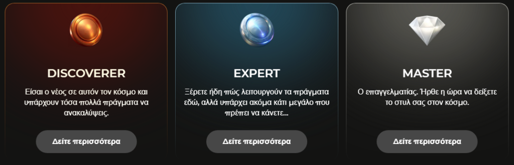 Το Spinstar.bet Casino προσφέρει ένα καλοσχεδιασμένο πρόγραμμα VIP που ανταμείβει τους πιστούς παίκτες με αποκλειστικά προνόμια, επιβραβεύσεις και αναβαθμίσεις στα επίπεδα VIP. Όσο περισσότερο παίζετε, τόσο ανεβαίνετε στη δομή του προγράμματος, απολαμβάνοντας καλύτερες ανταμοιβές, προσωπική εξυπηρέτηση και μοναδικά οφέλη. Οι παίκτες ξεκινούν από το επίπεδο Discoverer και μπορούν να φτάσουν έως το κορυφαίο επίπεδο Guru. Παρακάτω παρουσιάζεται ο πίνακας με τα επίπεδα VIP όπως φαίνονται στην επίσημη ιστοσελίδα του Spinstar.bet: